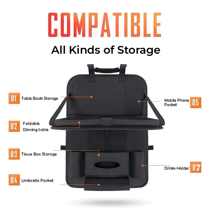 The Car Back Seat Organizer also features a fold-out table tray, perfect for holding snacks, drinks, or your tablet or phone. And the built-in tissue box holder keeps tissues within easy reach.